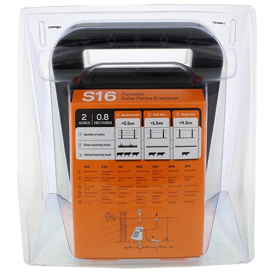 The S16 is the ultimate portable energiser solution, storing 0.16 J and capable of powering up to 1 mile/1,5km or 0.5 hectare of Multi-wire fence. The energiser comes complete with a rechargeable battery and solar panel.